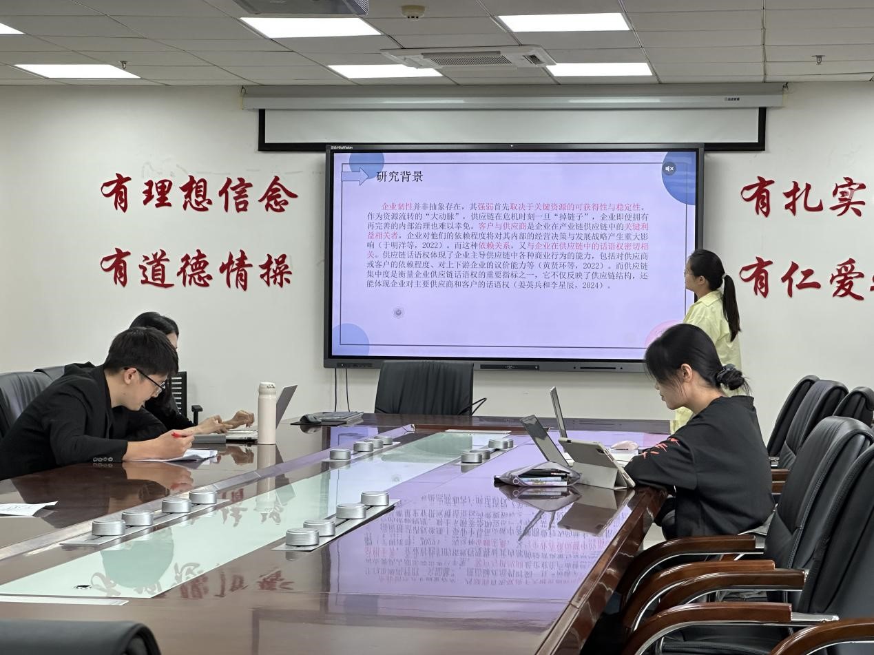 2024级研究生罗静和姜庆哲分别就其研究成果进行了汇报。罗静同学的论文《供应链话语权对企业韧性的影响研究——来自A股上市公司的证据》,基于A股上市公司数据,深入探讨了供应链话语权在企业应对风险挑战、构建韧性能力中的关键作用;姜庆哲同学则汇报了《殊途同归不同效:何种数字营商环境生态有助于提升企业创新韧性及其绩效?》,聚焦不同数字营商环境生态对企业创新韧性及绩效差异化影响,研究视角新颖,具有较强的理论创新与实践启示。