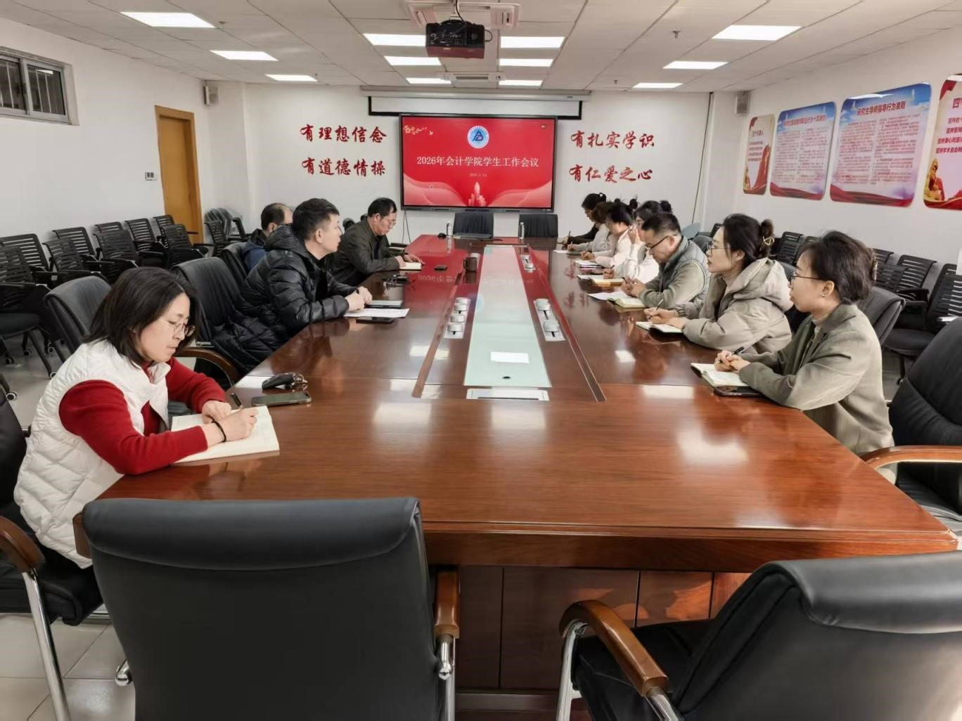 3月13日,会计学院在学院会议室召开2026年学生工作部署专题会议,传达学习学校新学期学生工作部署会议精神,研究部署学院年度学生工作。学院领导班子、团委书记、全体辅导员参会,会议由学院党委副书记冯冲主持。